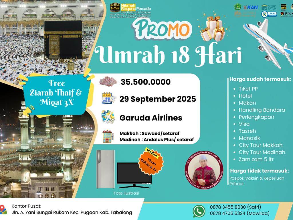 - Finalty Reffund 50% (Dari total yang telah disetorkan), 25 Hari Sebelum Keberangkatan.