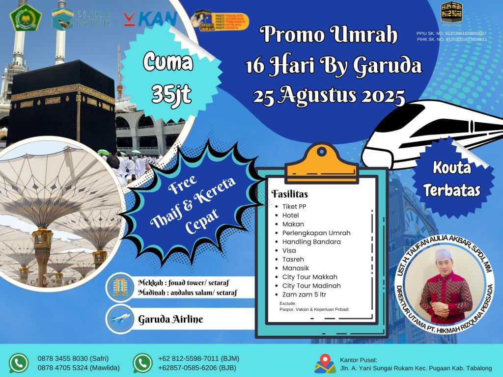 - Finalty Reffund 50% (Dari total yang telah disetorkan), 25 Hari Sebelum Keberangkatan.