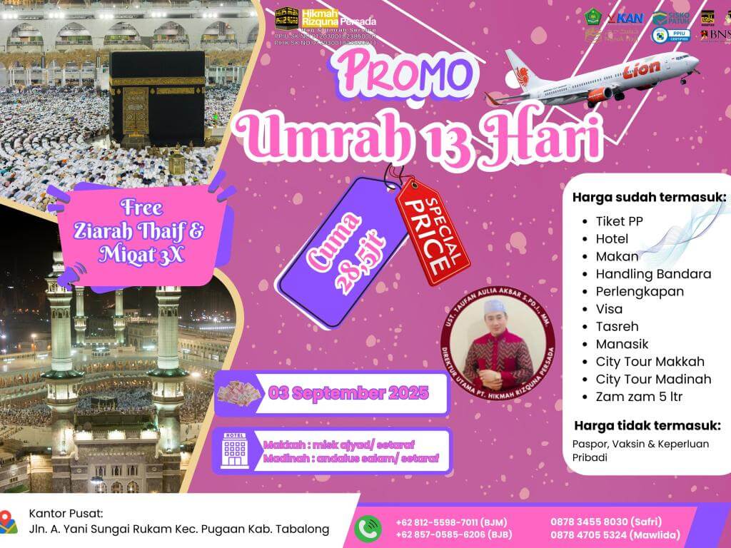- Finalty Reffund 50% (Dari total yang telah disetorkan), 25 Hari Sebelum Keberangkatan.