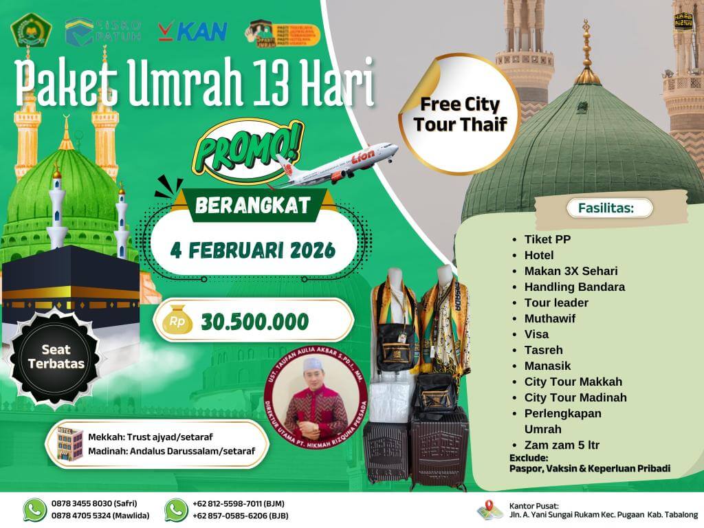 - Finalty Reffund 50% (Dari total yang telah disetorkan), 25 Hari Sebelum Keberangkatan.